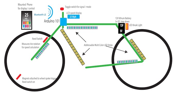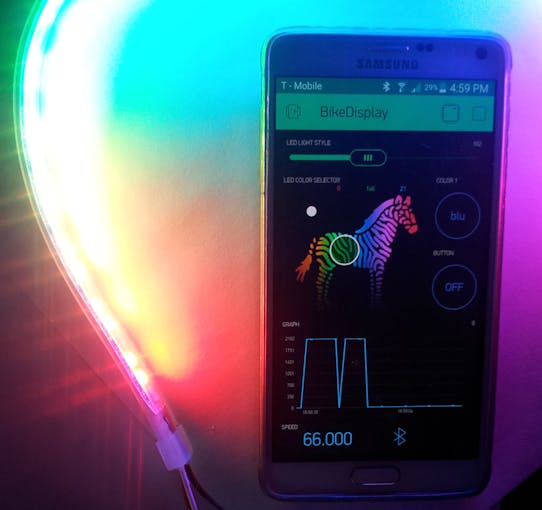Once every month I ride with "Critical Mass" cycling group of 300+ riders roaming city at night. I want to pimp up my bicycle with unique colorful lights that react to how I ride for safety and attention.