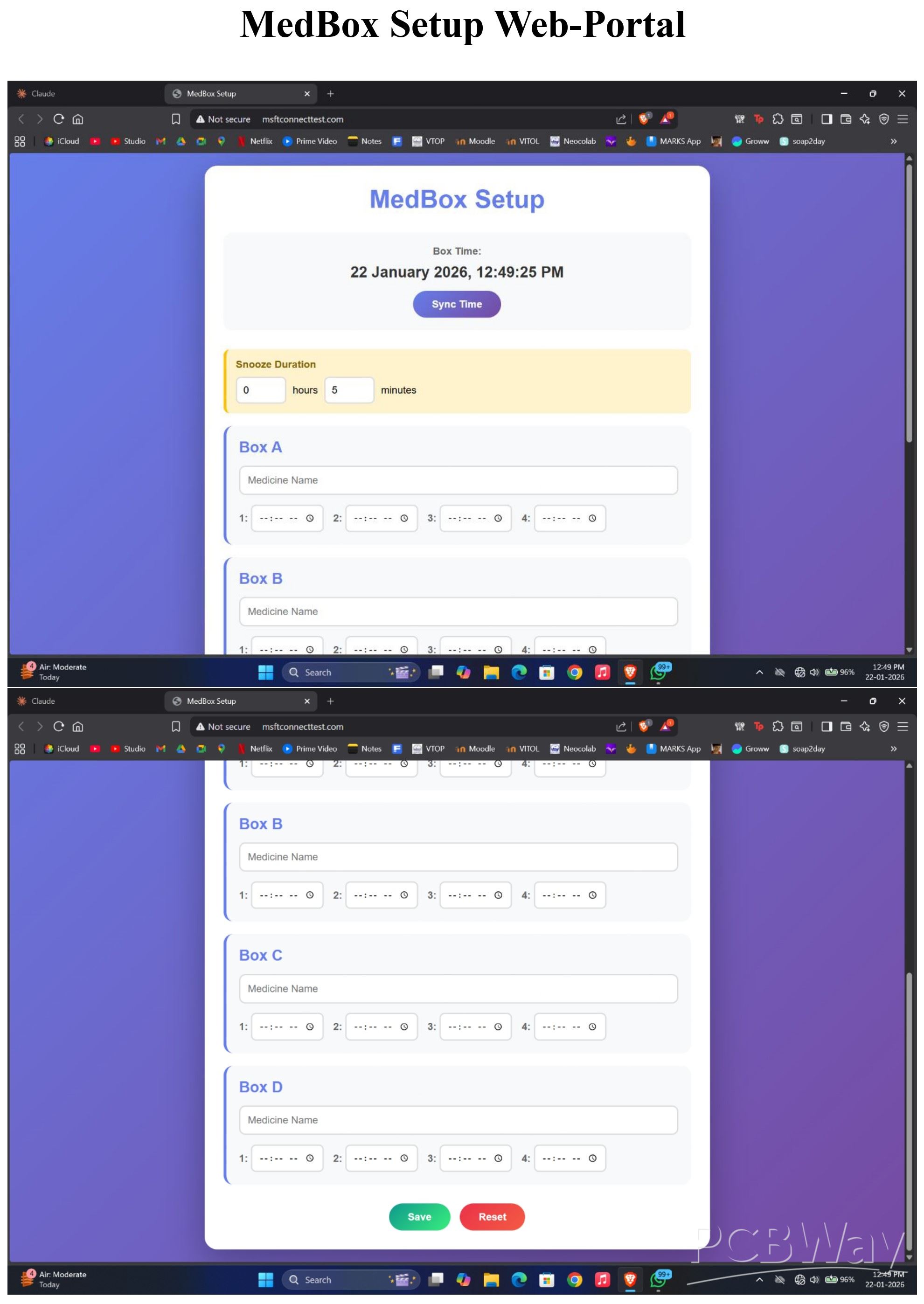 - A fully functional setup web portal where you can set the alarms and sent it to MedBox