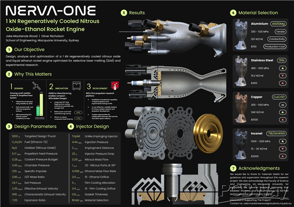 From a hardware perspective, the project aims to transition toward increasingly monolithic additively manufactured engine systems, where multiple components are integrated into single part architectures to reduce assembly complexity. Experimental hot fire testing remains a critical priority to validate injector atomisation, regenerative cooling effectiveness, thrust output, and the broader analytical models developed throughout the project. Beyond a single engine, NERVA-ONE is intended to become a scalable research platform supporting future honours, masters, and multidisciplinary engineering projects, helping establish a long term student propulsion capability at Macquarie University and contributing to Australia’s growing aerospace and sovereign space capabilities.