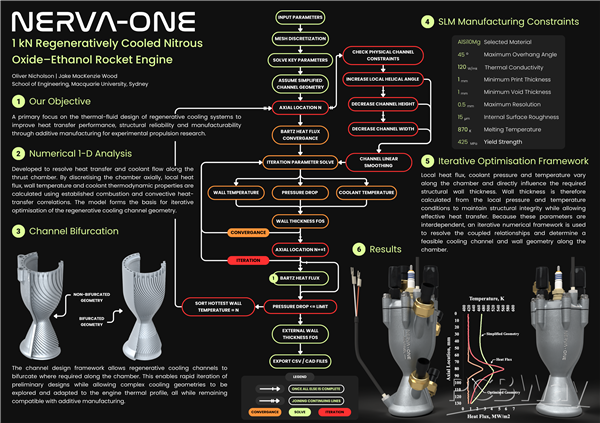 NERVA-ONE; a 1 kilonewton, ethanol-70/nitrous oxide liquid bipropellant rocket engine, designed around a regeneratively cooled thrust chamber to withstand high heat flux at chamber pressures of 3.45 MPa. The chamber and nozzle are additively manufactured from AlSi10Mg, with integrated cooling channels that follow the internal contour of the engine. A defining aspect of the design is the fully coupled optimisation approach, where parameters such as channel height, width, helix angle, and wall thickness are varied along the engine length to balance thermal performance, structural integrity, and pressure drop within a constrained geometry. This allows the engine to move beyond uniform, constant geometry designs, instead producing a highly tailored thrust chamber optimised for both performance and manufacturability.