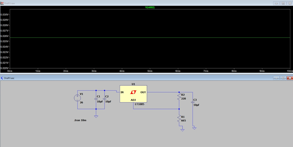Voltage Regulator Analysis (LT1085). The schematic represents an adjustable LT1085 regulator stage that reduces a 26 V input to approximately 5 V through a resistor divider. The corresponding waveform confirms the regulated output level.