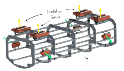 The Levitation subsystem is built on an Electromagnetic Suspension (EMS) mechanism, designed to achieve contactless vertical lift by generating a controlled magnetic field. The system includes custom-designed electromagnets, power-efficient driver circuits, and precise feedback loops that dynamically adjust lift force based on sensor inputs. This allows the pod to float above the track with minimal drag, improving efficiency and safety.