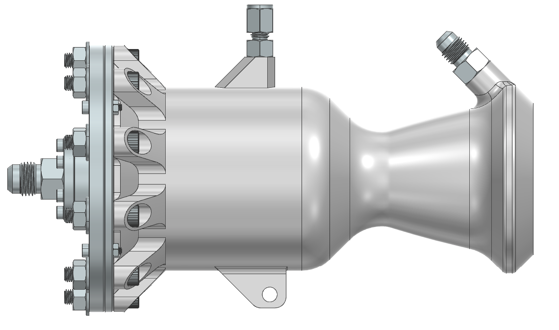 This year the team is looking to expand into the world of amateur liquid-fueled rocket engine. The beginning of our liquid rocket engine journey starts with this engine - a small 500lbf testbed engine intended to demonstrate that SRT is capable of designing and safely operating liquid-fueled rocket engines. The goal of this engine is to develop Texas A&M University's first regeneratively cooled liquid rocket engine.