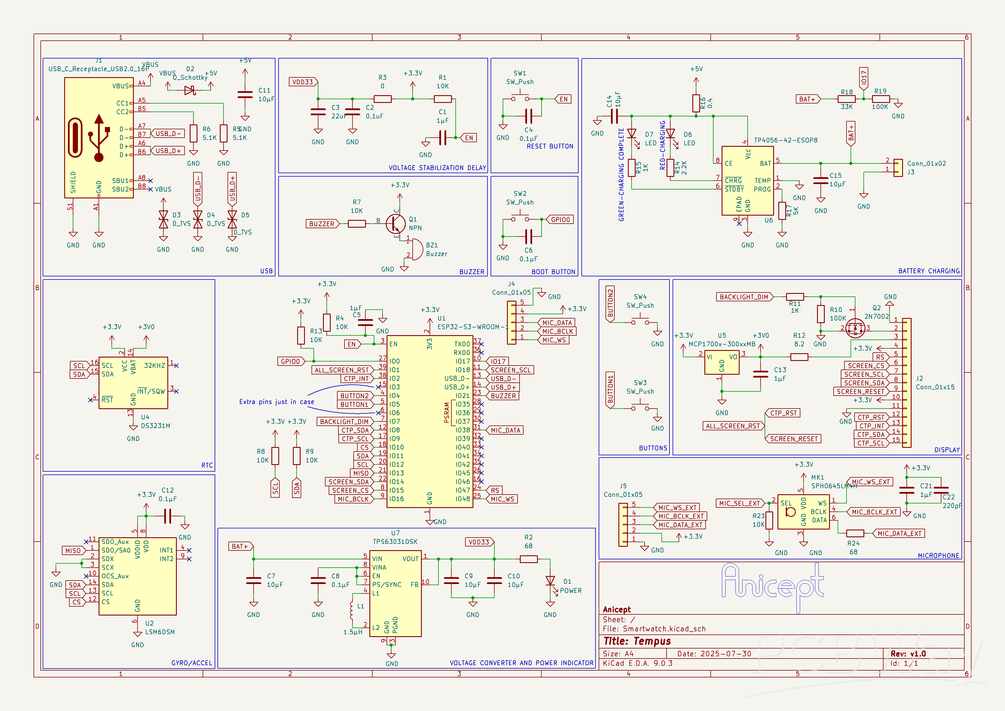 The Tempus is a small yet powerful ESP32 devboard PCB, equipped with all the features that a modern digital smartwatch would need. Fully able to track steps and gestures, voice text, make beeps and alerts with a buzzer, power a round touchscreen, and, of course, tell time, it's the ideal replacement for a multi-hundred-dollar smartwatch with the same features: