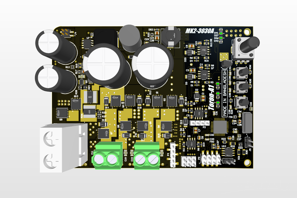 Toron-A1 is a high-power, intelligent dual brushed DC motor driver designed for rover and heavy-duty mobile robotics applications. The system is engineered to not only drive motors but also to actively monitor, protect, and adapt under harsh operating conditions—making it suitable for research, field robotics, and industrial-grade mobile platforms.