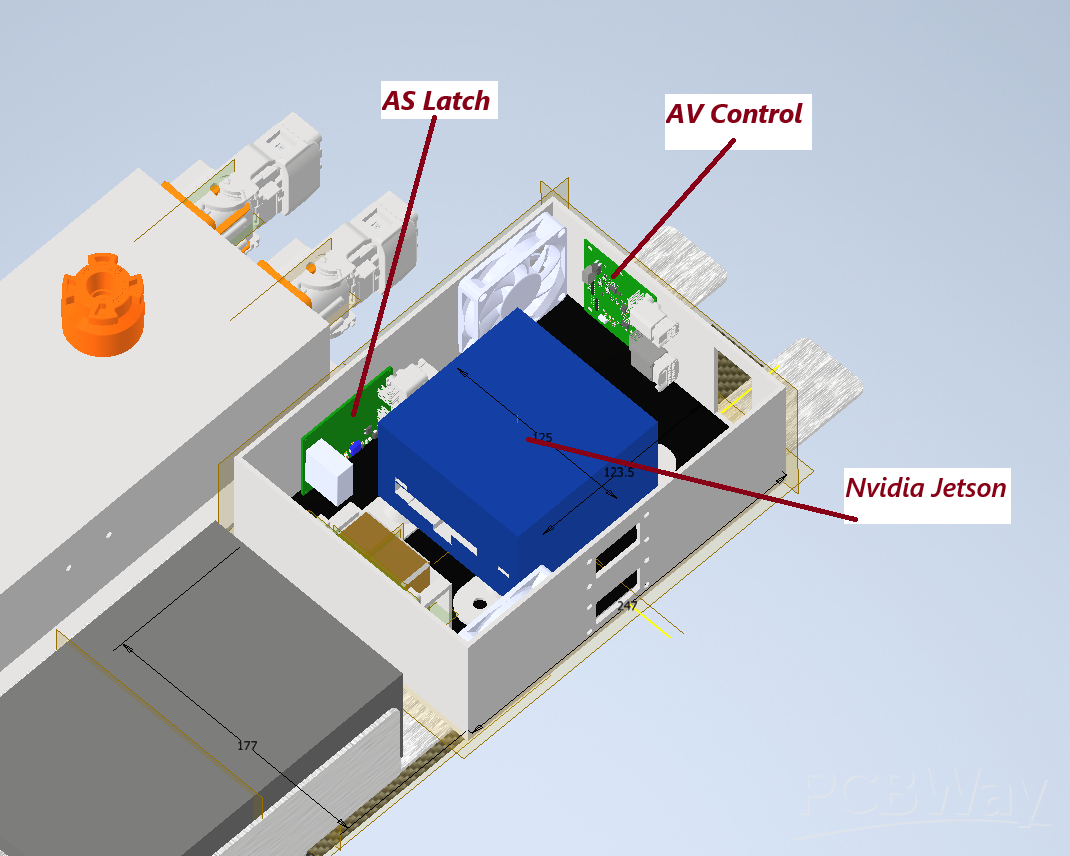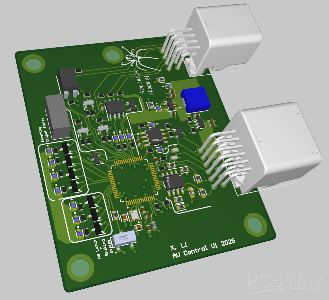 The AV Control PCB is responsible for managing the autonomous steering and braking actuators. It receives CAN bus data from the NVIDIA Jetson, which processes sensor inputs and makes real-time driving decisions.