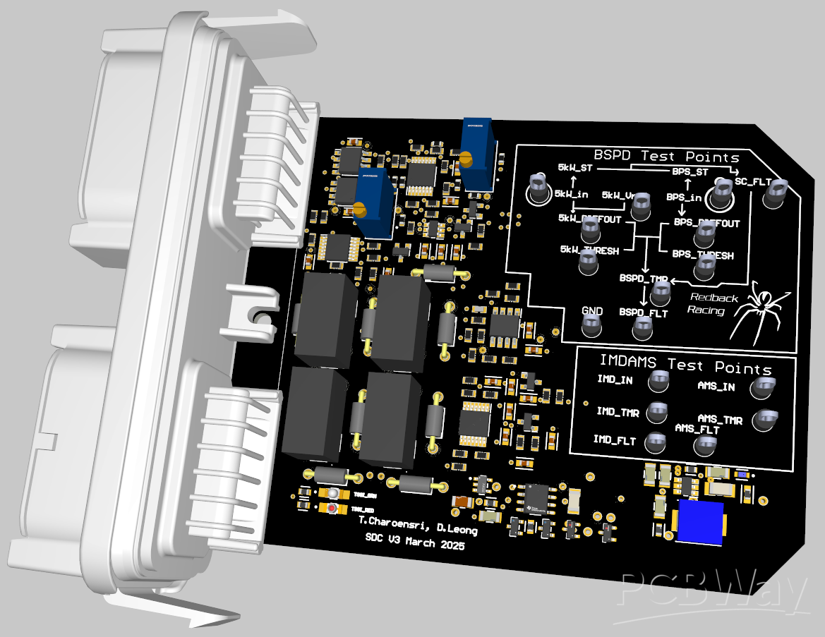 SDC is the safety circuit for when RB25 is in driver mode. It checks 4 conditions to ensure safety which are, Brake System Plausibility Device (BSPD), Insulation Monitoring Device (IMD), Accumulator Management System (AMS) and Pre-charge Discharge Over Current (PDOC).