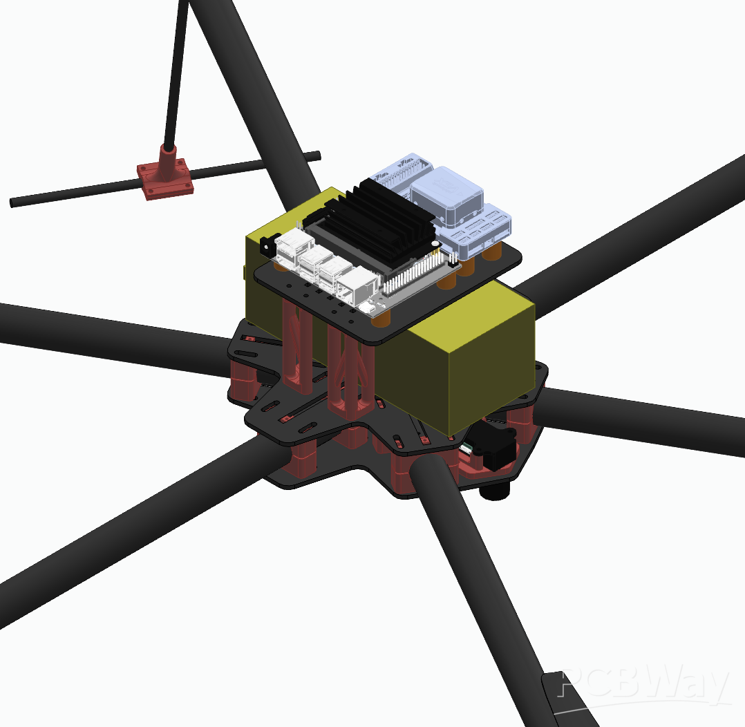 The drone itself is equipped with high-performance components that ensure stable, reliable, and efficient operation. At its core, it uses the NVIDIA Jetson Orin Nano for processing flight data and handling communication with the app and base station. Flight control is managed by the CUAV Pixhawk V6X, a proven and robust autopilot system that delivers precise navigation and safe flight behavior. To provide the necessary lift and efficiency, the drone operates with Tarot 5008 340kv motors, which are designed for high thrust output and energy efficiency—ideal for carrying payloads consistently over multiple missions.