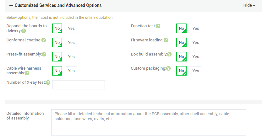 1. You can click Additional Options to get more customization, eg: Depanel the boards to delivery, Conformal coating, Firmware loading, Cable Wire Harness Assembly, etc.