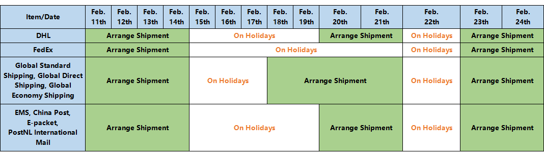 | Factory’s Production and Shipment Schedule During Chinese Spring Festival (GMT+8) | |||||||||||